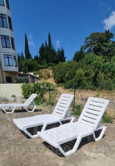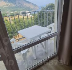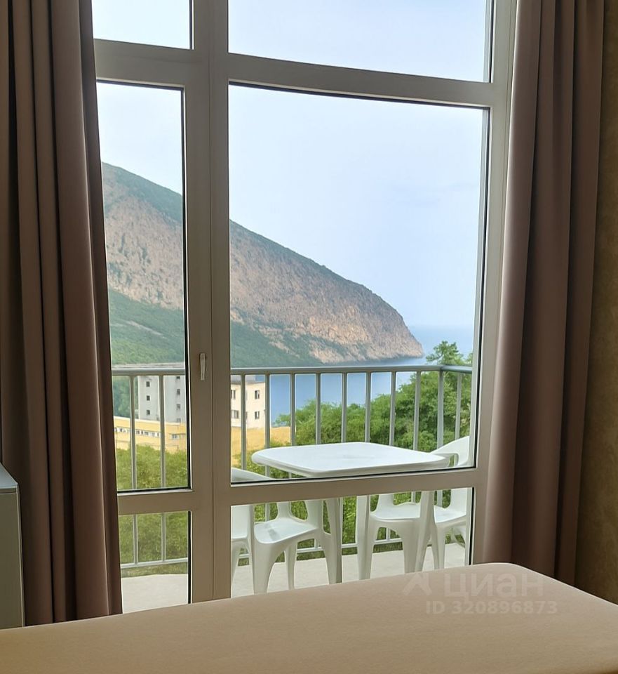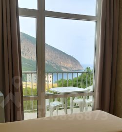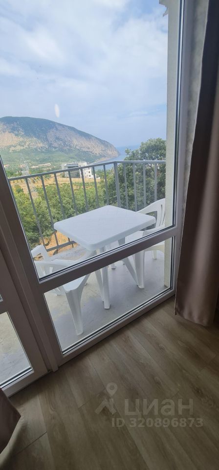 Уютная комната-студия с шикарными видами на море и Медведь-гору со всеми удобствами: кухня, электрочайник, холодильник, кондиционер, смарт-тв, вайфай, сан.узел, горячая вода, шкаф, стол со стульями, балкон с летней мебелью. Также есть парковка для машины. На территории - бассейн, гамаки, шезлонги, батут, кресло-кокон, мангальная зона, стол с лавочками, на деревьях гирлянды (создают приятную вечернюю атмосферу).