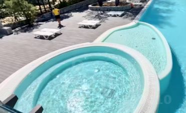 Подогреваемый открытый бассейн с детской зоной и джакузи, современные детские площадки, смотровые площадки с качелями и гамаками.