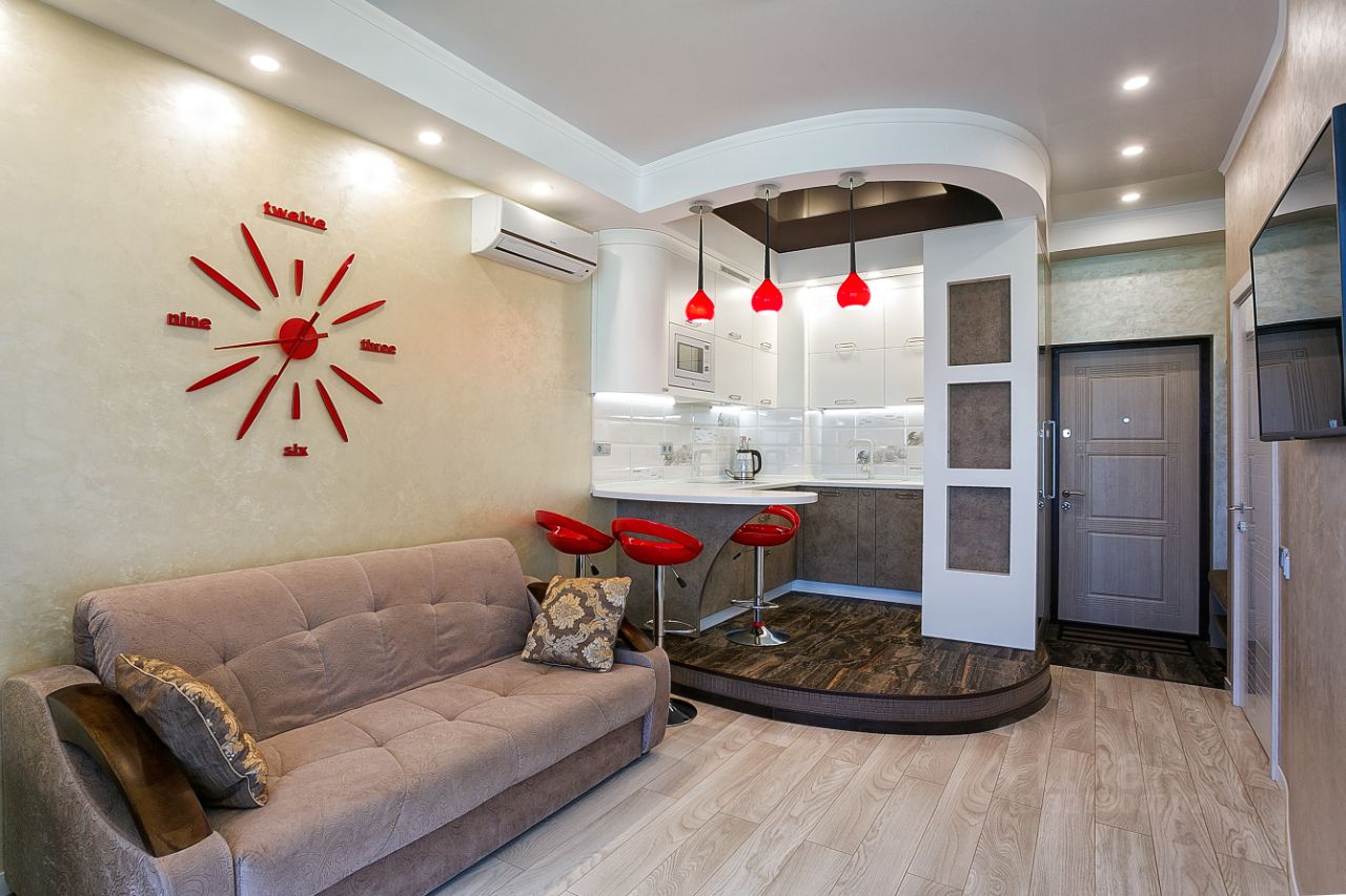 - современная кухня: электроплита, электрочайник, микроволновая печь, холодильник, стол и стулья, столовые приборы, посуда;