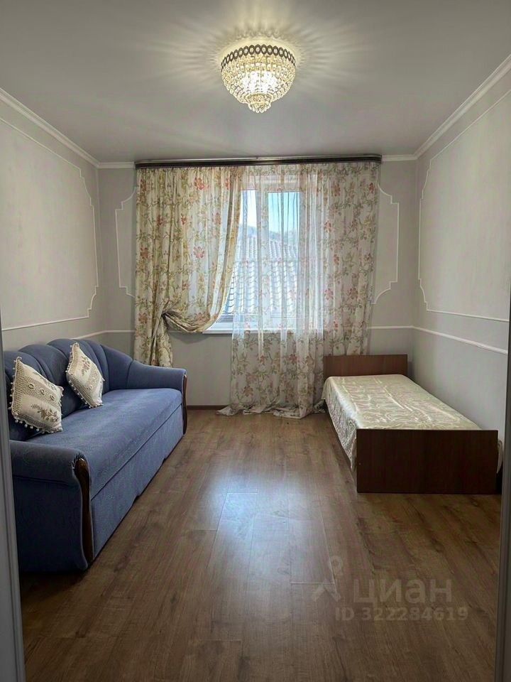 В гостиной установлен диван и кровать, а также имеется выход на балкон с видом на улицу и открывается вид на зелёный двор.