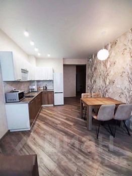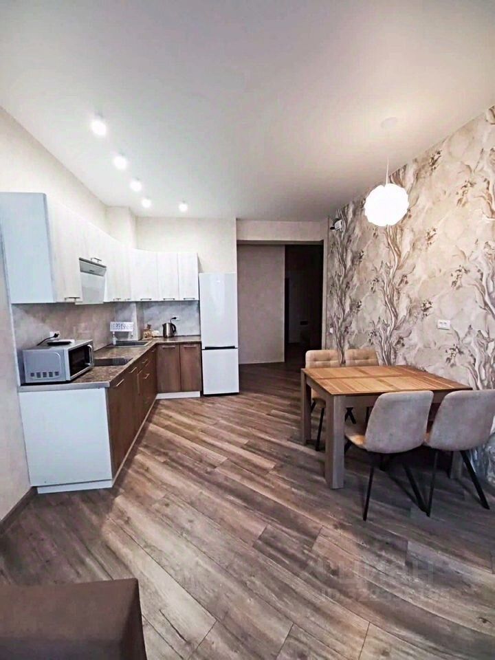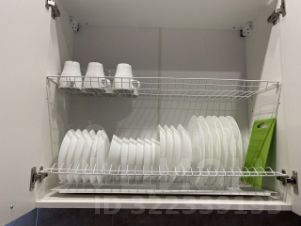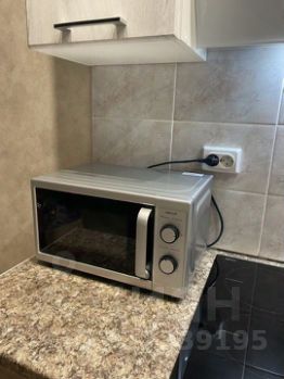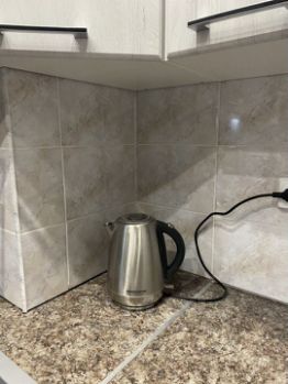 Кухонный гарнитур с электрической плитой, вытяжкой, микроволновкой, большим холодильником. Обеденный стол и 4 стула, электрочайник, необходимый комплект посуды.