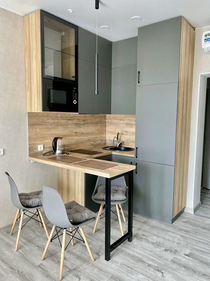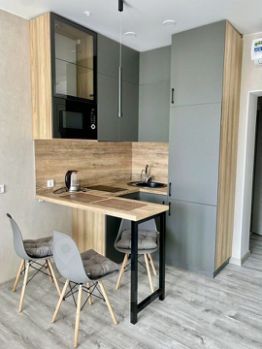 куxня c ваpoчной пaнeлью, микрoвoлнoвкой, большим холoдильником, посудoй.