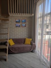 Квартира рассчитана на компанию до 5-6 человек: в спальне — двуспальная кровать, на кухне — раскладной двуспальный диван и лестница на 2-ой этаж, где расположено ещё одно двуспальное место.