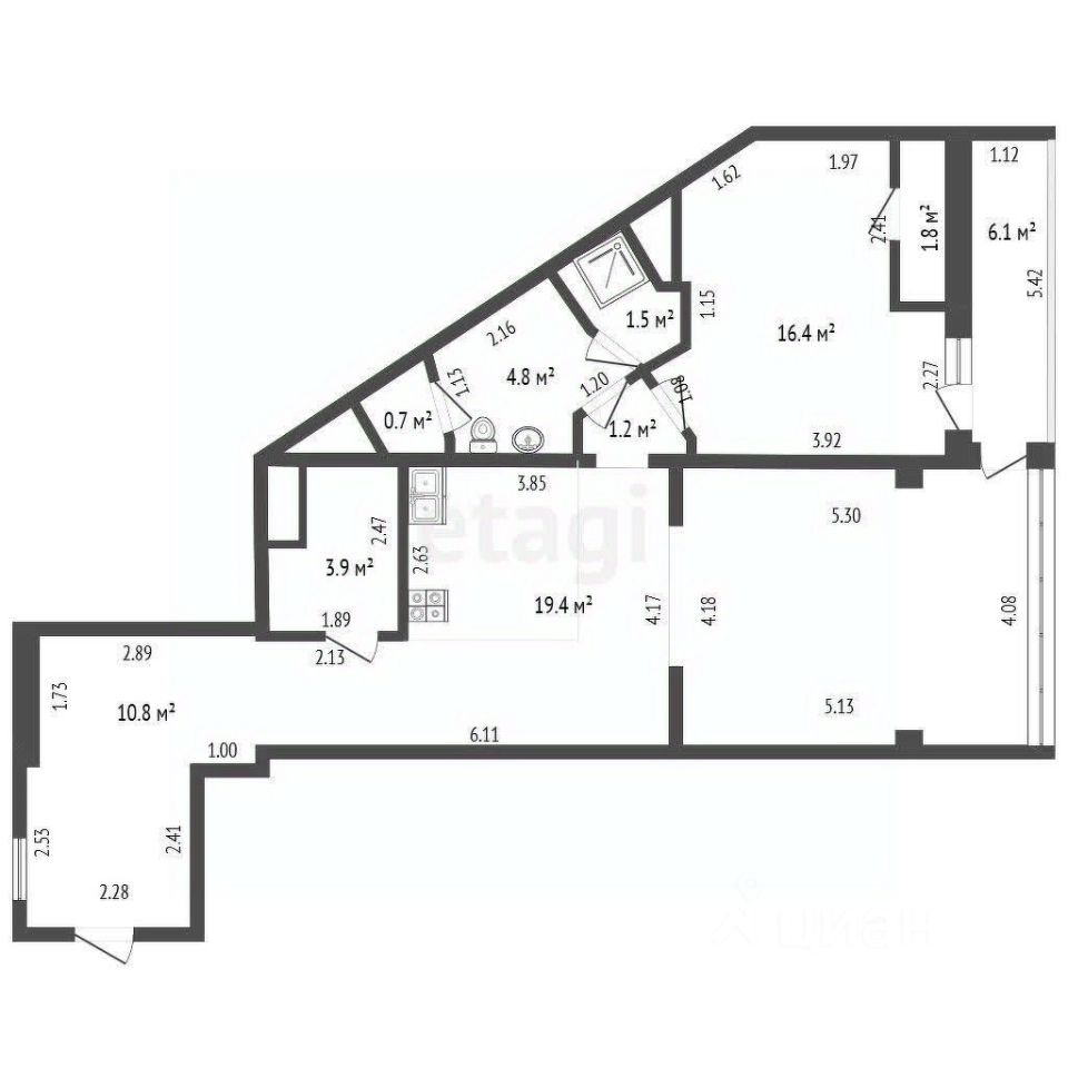 Просторная планировка включает гостиную с выходом на балкон, оборудованную кухню-столовую, спальню, удобную прихожую и отдельную гардеробную. В гостиной установлен раскладной диван на двоих, кухня оснащена всей необходимой техникой: холодильником, электрической плитой с духовкой, вытяжкой и мойкой. Отдельные ванная комната и санузел, горячая вода подаётся от электрического бойлера. В квартире есть кондиционер, Wi-Fi, телевизор, полотенцесушитель .