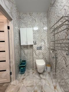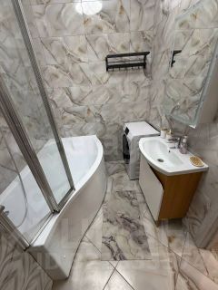 В санузле выполнен ремонт с использованием качественной плитки и оснащен современной техникой.