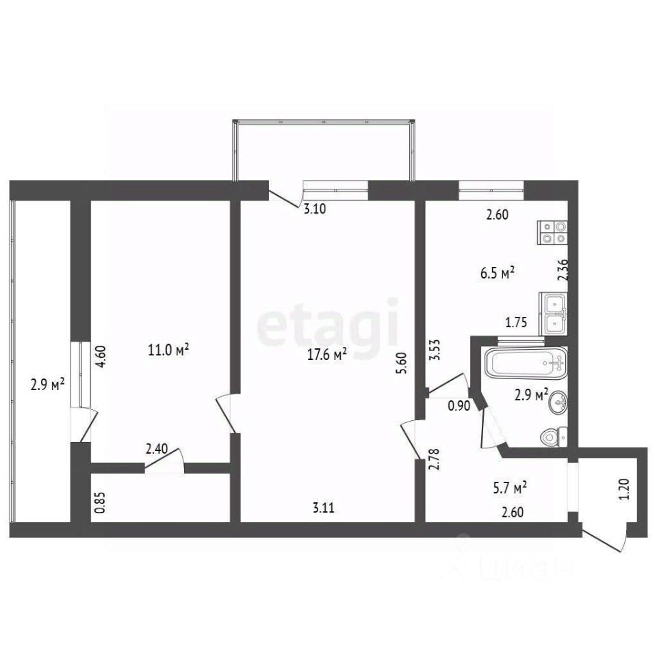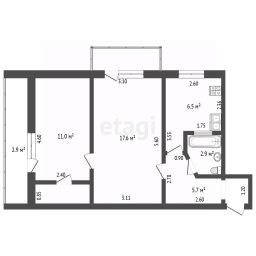 Квартира расположена на 4 этаже пятиэтажного дома, и имеет удобную планировку, включая зал и жилую комнату площадью 17.6 и 11 кв. метров, кухню площадью 6,9 кв. метров.