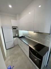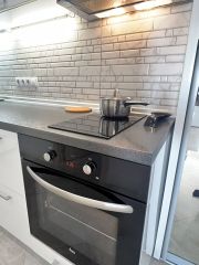 Студия оборудована полноценной кухней с необходимой бытовой техникой: