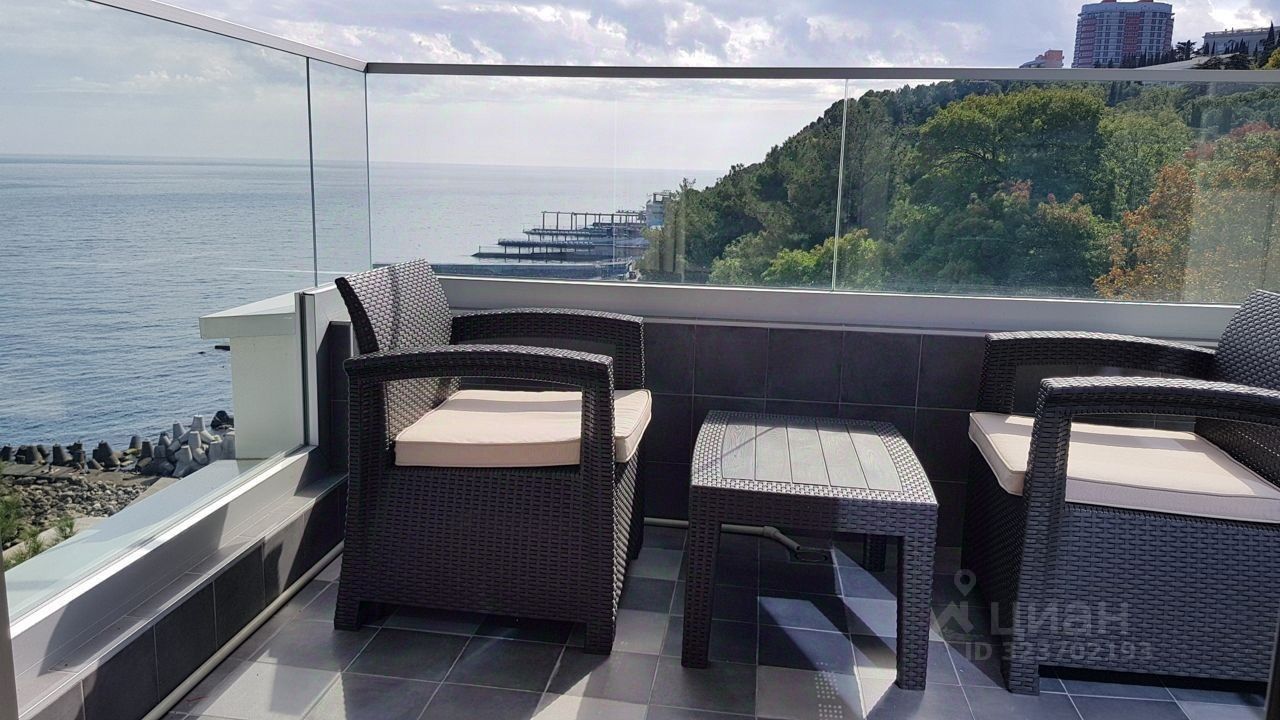 - балкон со столиком, стульями и шикарным видом на море и парк.