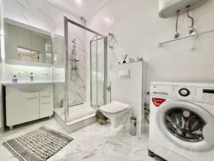 Санузел: душевая кабина, умывальник, унита3, стиральная машина.