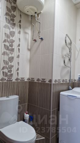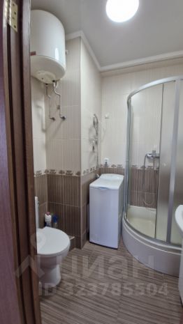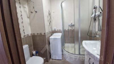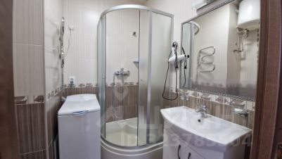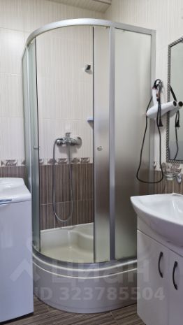 Современный санузел: душевая кабина с бойлером, вертикальная стиральная машина, фен, большое зеркало;