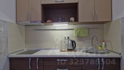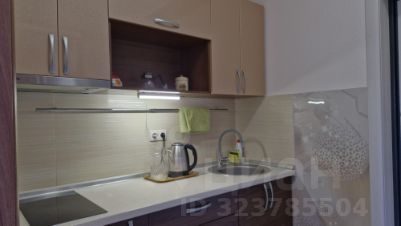 Кухня-гостиная: варочная панель, современный гарнитур, холодильник, микроволновка, посуда;