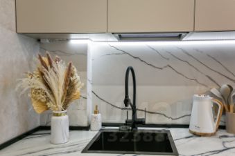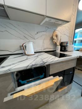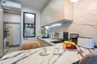 Бытовая техника: стиральная машина, посудомойка, духовка, электро плита, электрочайник, тостер, кофеварка, бокалы, кружки, чай - кофе, полная комплектация) и столовые приборы ,большой встроенный вместительный шкаф вдоль всей стены.