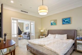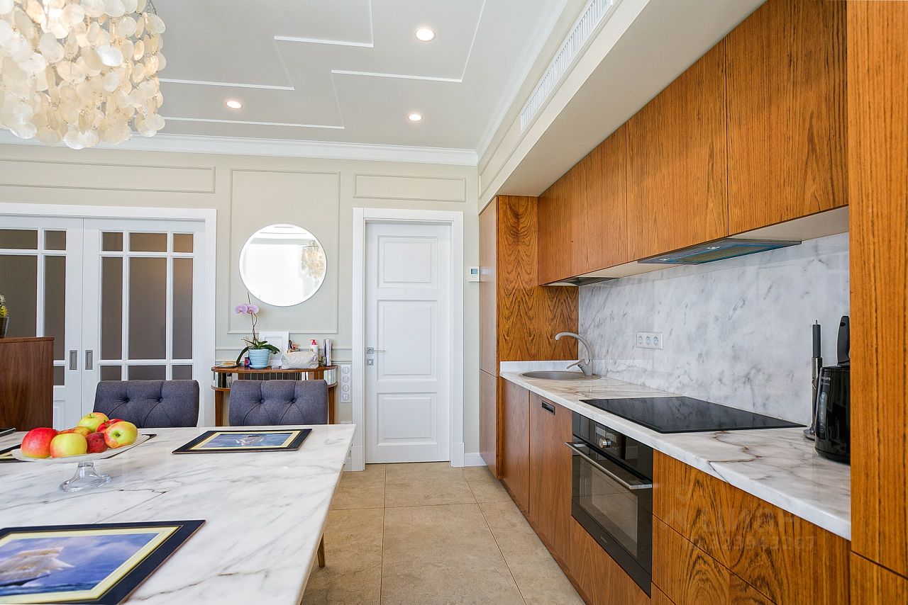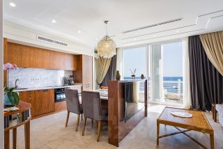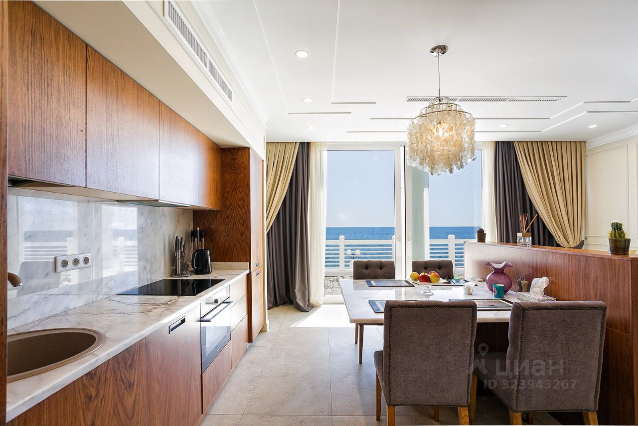- Мебель из шпона дерева производства Италии и России, мрамор, шторы блэкаут, картины крымских художников на стенах