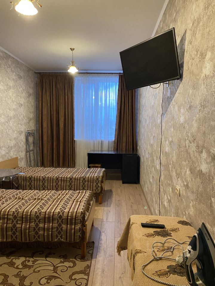 В одной комнате 2 х спальная кровать , столик , шкаф , кресло, телевизор.
