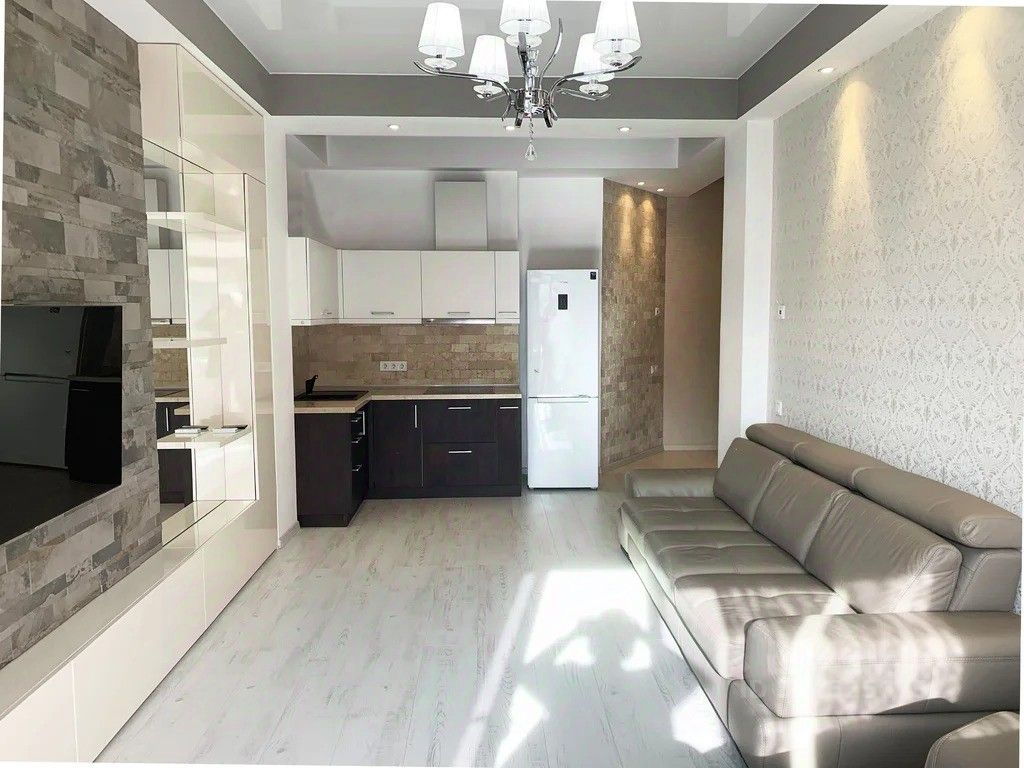 Квартира расположена на первом этаже пятиэтажного дома. В ней просторная светлая гостиная, которая объединена с кухней и обеденной зоной. В спальне есть большое окно, двуспальная кровать, шкаф и встроенные прикроватные тумбочки. Санузел совмещенный.