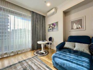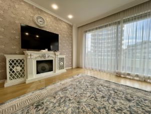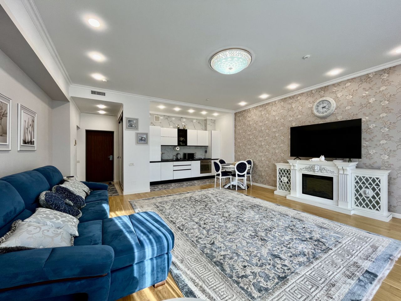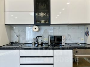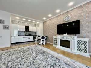ЖК телевизор, кондиционер, электрочайник, холодильник, стол и стулья, столовые приборы, электроплита, духовой шкаф, СВЧ печь, посудомоечная машина, выход на балкон.