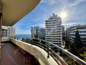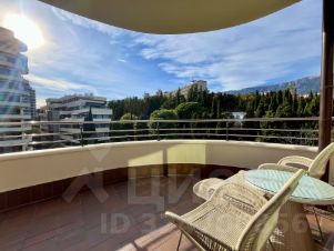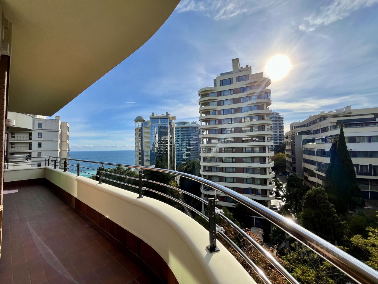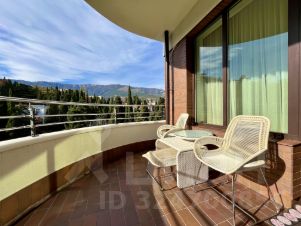 Большой открытый балкон с летней мебелью и потрясающим видом на море, парк,Крымские горы.