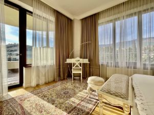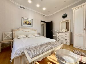 Спальня: двуспальная кровать, шкаф, комод, кондиционер, ЖК телевизор, выход на открытый балкон с мебелью.