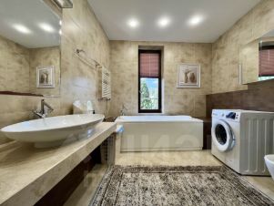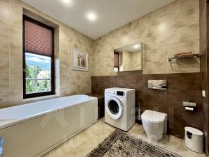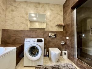 Санузел с окном: ванна, душевая кабина, умывальник, унитаз, стиральная машина.
