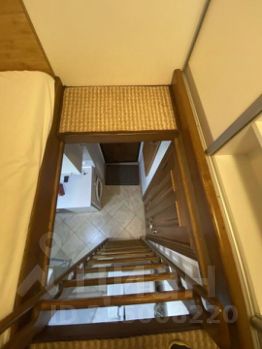 Внизу функциональная кухня со всем необходимым: гарнитур, плита, холодильник, посуда; наверху - широкая двуспальная кровать и вместительный шкаф.