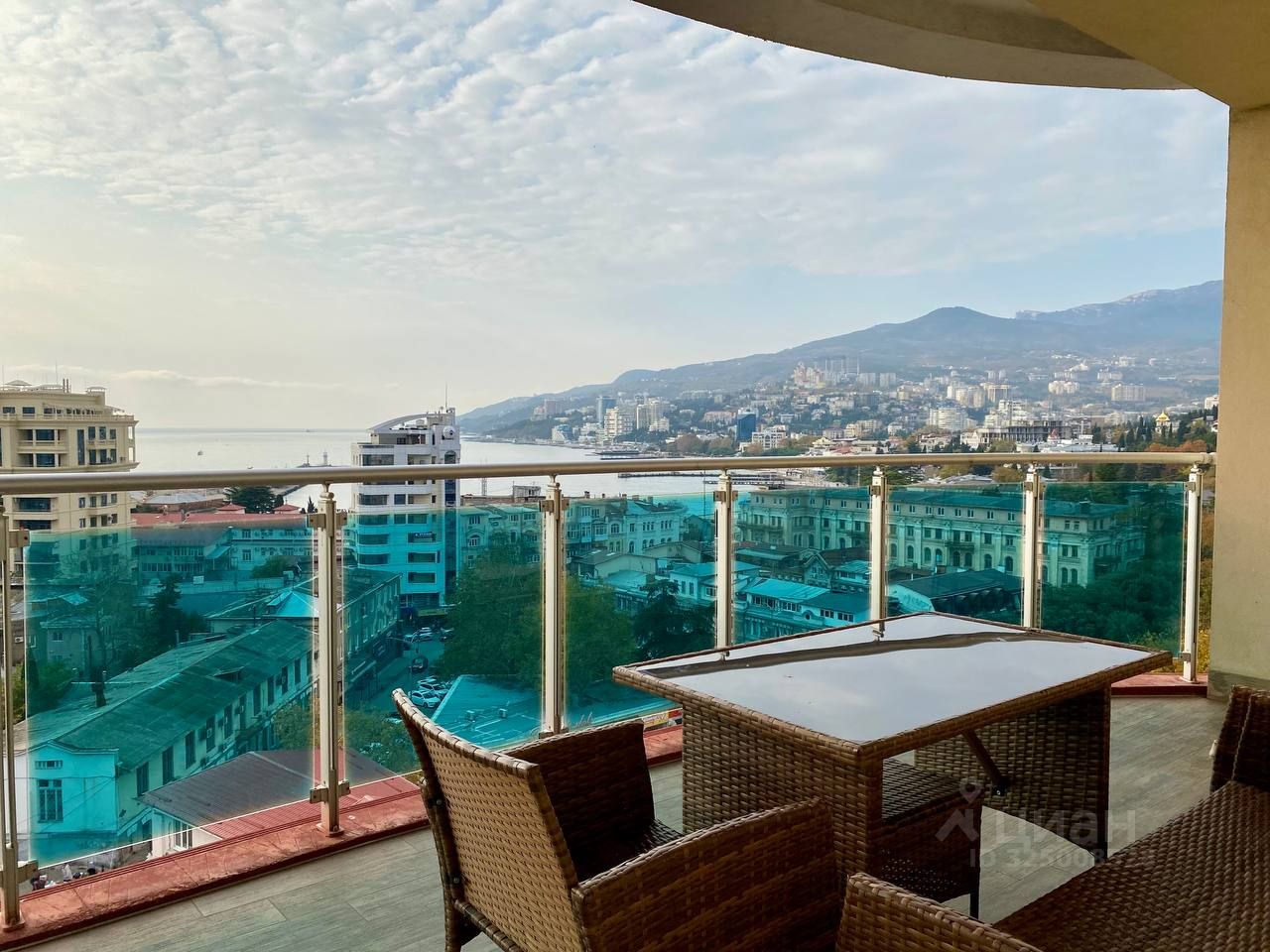 -Балкон с видом на город, море, Ай-Петри, ротанговая мебель.