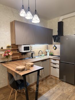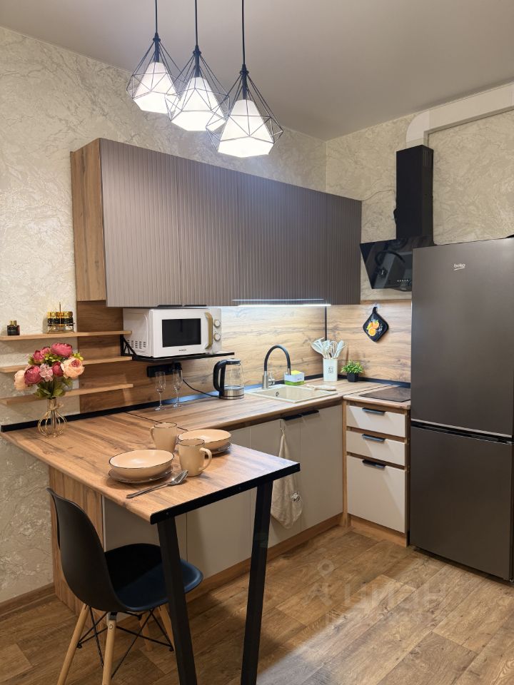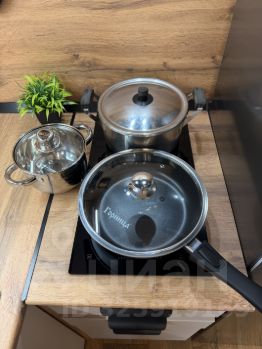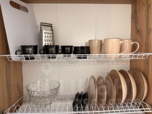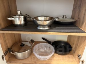Установлена полноценная кухня с большой рабочей поверхностью, барной стойкой, вытяжкой, плитой, микроволновой печью, чайником, набором для приготовления еды и комплектом посуды.