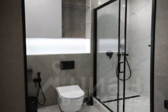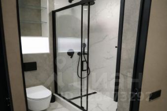 Современная ванная с душевой кабиной, стеклянными перегородками и качественной сантехникой.
