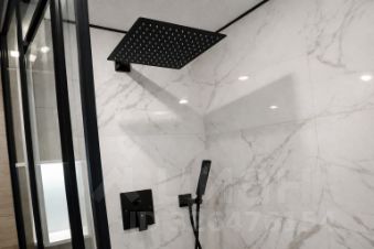 Современная ванная с душевой кабиной, стеклянными перегородками и качественной сантехникой.