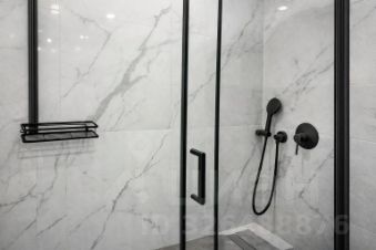 Современная ванная с душевой кабиной, стеклянными перегородками и качественной сантехникой.