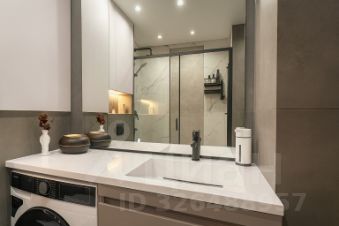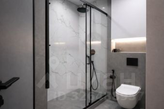 Современная ванная с душевой кабиной, стеклянными перегородками и качественной сантехникой.