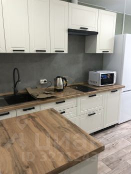Кухня оборудована всей необходимой бытовой техникой, включая холодильник и микроволновую печь. В гостиной установлен удобный диван и шкафы для хранения вещей.