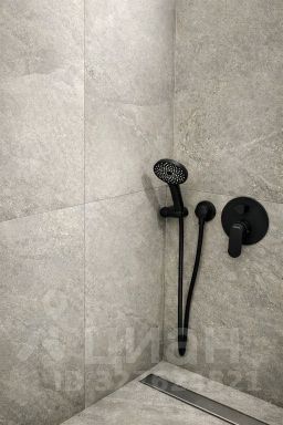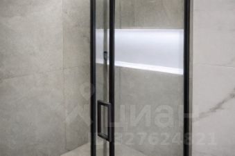Современная ванная с душевой кабиной, стеклянными перегородками и качественной сантехникой.