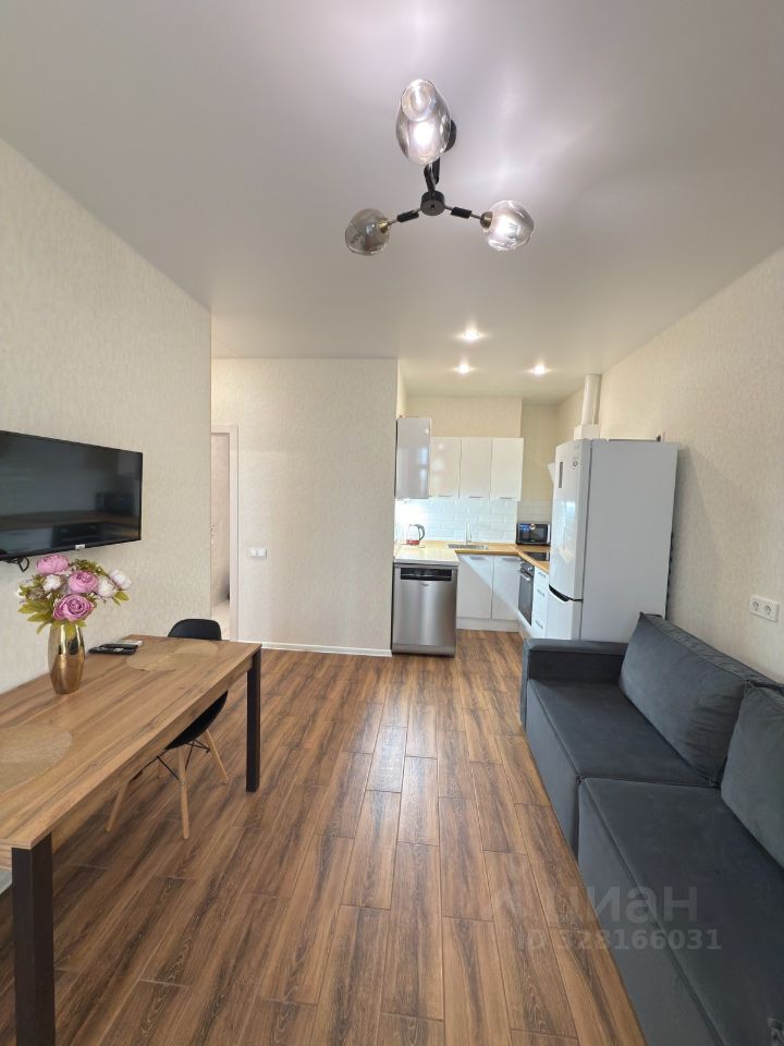 Общая площадь — 44 кв. м. Просторная кухня-гостиная объединена с зоной отдыха. На кухне установлена встроенная техника: духовой шкаф, посудомоечная машина, холодильник, вытяжка. В зоне гостиной расположен удобный диван. Есть балкон с выходом из кухни.