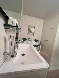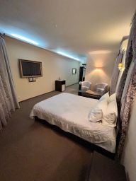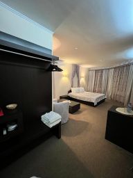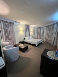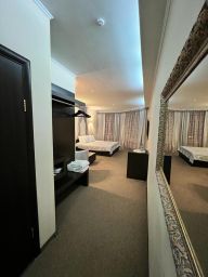 В номере: двуспальная кровать, прикроватные тумбочки, два кресла, письменный стол, гардероб, зеркало, телевизор, сейф, кондиционер, холодильник, интернет Wi-Fi. В ванной: ванна, раковина, туалет, средства личной гигиены, тапочки, халат, фен.