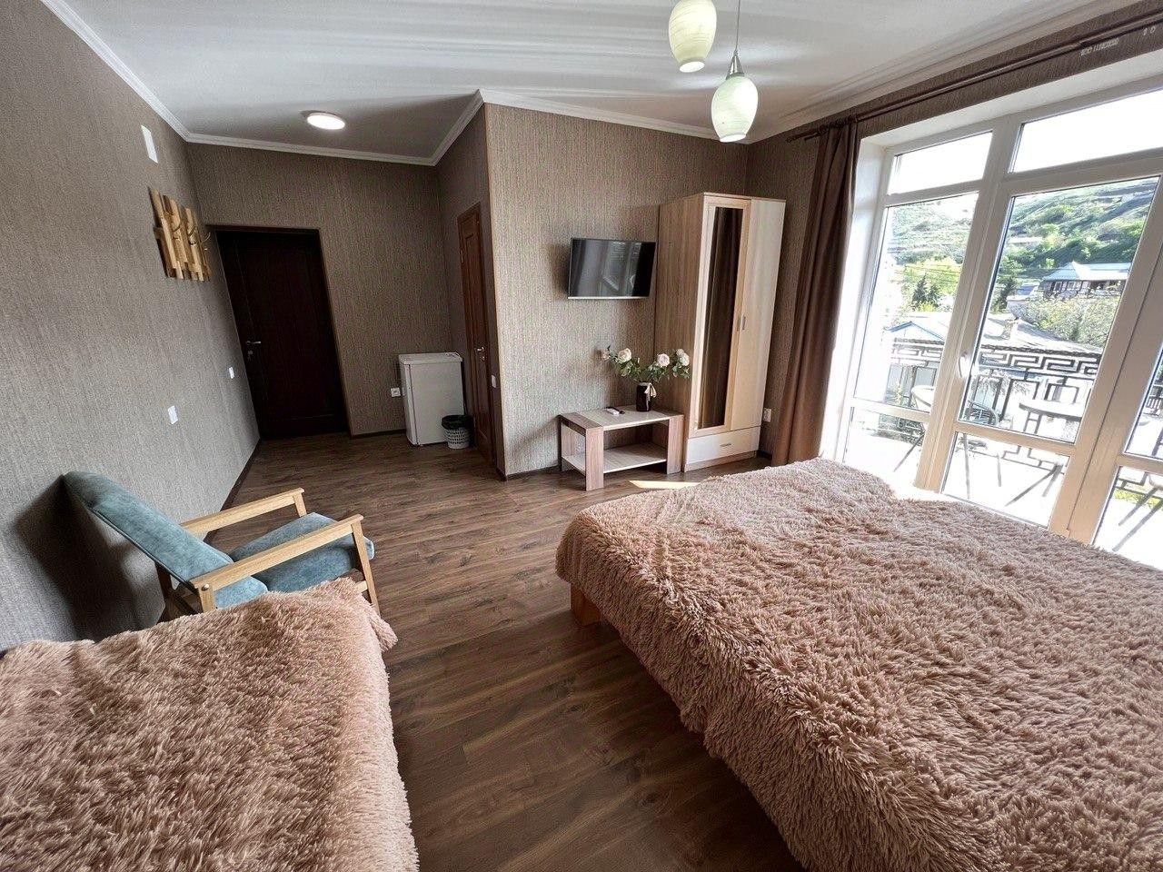 Современный номер для комфортного проживания 2-3-x человек. В номере есть собственная ванная комната, кондиционер, холодильник, телевизор, шкаф с комодом, Wi-Fi.