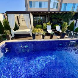 Стоимость проживания зависит от сезона и количества дней проживания. Коттедж находится в 50 метрах от берега моря, с собственным выходом на пляж в двух минутах ходьбы от пешеходной набережной, с многочисленными кафе, ресторанами, аттракционами. Дом 250 квадратных метров на 4 сотках земли. Состоит из 3 этажей. 4 отдельные спальные комнаты с видом на море. 1-й этаж : гостиная, столовая совмещенная с кухней, санузел с душевой. 2-й : 2 спальни с двуспальными кроватями, с отдельными лоджиями с видом на море, отдельными санузлами и душевыми кабинами. 3 -й этаж : 2 отдельные спальни с двуспальными кроватями, с лоджиями и видом на море, комнаты оборудованы кондиционером, с отдельными санузлами и душевыми кабинами. Во всех комнатах имеется фен, постельное белье, полотенца, гладильная доска, утюг, косметические принадлежности. В стоимость также входят халаты тапочки. Кухня-столовая: комплект посуды на 12 персон, посудомоечная машина, ледогенератор, соковыжималка, кофемашина, микроволновая печь, духовой шкаф, холодильник, холодильная камера, электроплита, установлена система очистки питьевой воды. Столовая на 10 персон. Зона патио укомплектована ротанговой мебелью на 10 персон, зоной мангала, тандыр и барбекю. Установлена кабана около бассейна . Вся мебель в доме из натуральных материалов. Терасса : озеленение , подогреваемый бассейн 3:6 метров, глубиной 1,6 метров, летний душ, шезлонги, индивидуальный выход к морю. Имеются шезлонги и зонты для пляжа. Коттеджный участок огорожен имеет собственную паковку на 2 автомобиля. Минимальный срок проживание 4 суток.