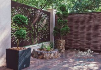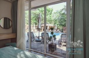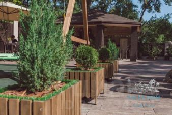 На придомовой территории виллы: ландшафтный дизайн, большая мангальная зона с беседкой, много элементов декора, зоны отдыха с гамаками, шезлонгами и скамейками. Два открытых бассейна: один бассейн с джакузи, другой бассейн (15м2) с подогревом и постепенным увеличением глубины.