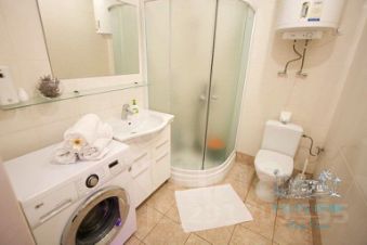 Первый этаж занимают большая кухня-столовая и санузел, оборудованный душевой кабиной.