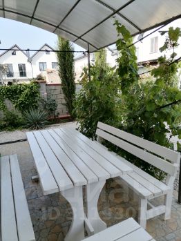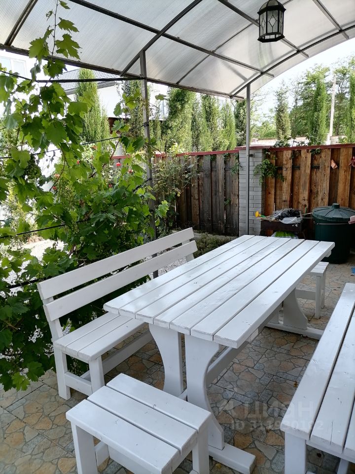 На заднем дворе терраса с садовой мебелью и мангалом.