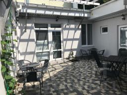 Есть уютный дворик, с зоной отдыха и барбекю.