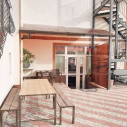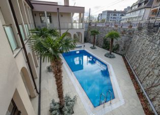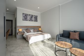 Для размещения отдыхающих представлено 6 комнат, с 4 различными уровнями комфортa. Интерьер выполнен в классическом стиле, в светлых пастельных оттенках. В числе удобств есть ЖК-телевизор, гардероб, холодильник, фен, Wi-Fi, кондиционер и собственная ванная комната. Оснащение общей кухни включает в себя набор необходимой посуды, чайник и микроволновую печь. Во дворе организована площадка барбекю для приготовления мяса и овощей. На территории есть бильярд, а так же бассейн, хамам и баня.