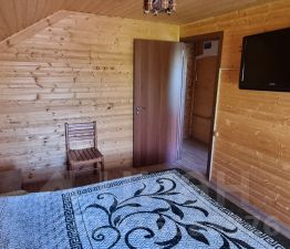 На территории расположено 2 домика. В каждом из них 2 спальни на втором этаже: "родительская" с большой кроватью и "детская" с двумя раздельными одноместными кроватями. Так же в зале на первом этаже раскладной диван. Во всех комнатах и на кухне есть телевизоры. Кондиционеры на обоих этажах.