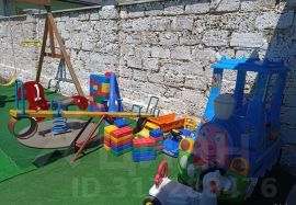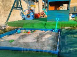 — Детский рай: песочница, игрушки, домик, качели, машинки.