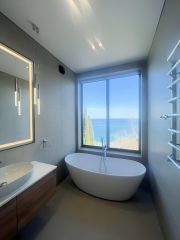 - ванная комната с панорамным видом на море, ванная, с/у и другие необходимые атрибуты.
