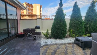Красивый оборудований дворик для комфортно отдыха, во дворе есть шезлонги, качельки.