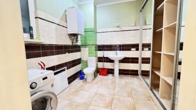 Также на первом этаже располагается санузел со стиральной машиной и гардеробная с большим шкафом-купе для хранения вещей.
