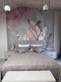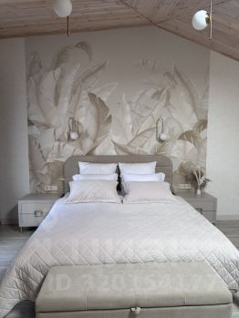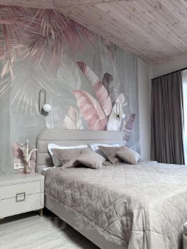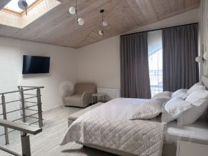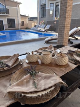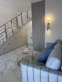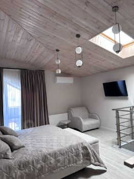 Дом общей площадью 104,5 кв.м, имеет два отдельных входа. Это полностью изолированные друг от друга помещения. В каждой половине здания просторная гостиная, санузел, вместительная гардеробная, встроенный холодильник и сейф, большой раскладывающийся диван. На втором этаже просторная спальня с большой кроватью 200/180 см, телевизор, кондиционер, кресло кровать, выход из спальни на балкон, с которого открывается прекрасный вид на бассейн и террасу.