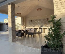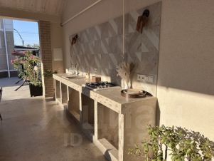 Терасса с летней кухней, мойка, газовая варочная поверхность, комплект плетеной мебели с обеденным столом на 7 персон.