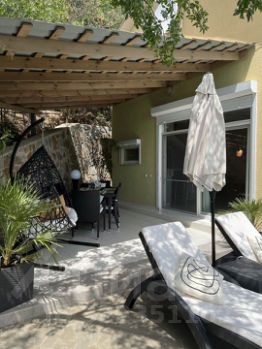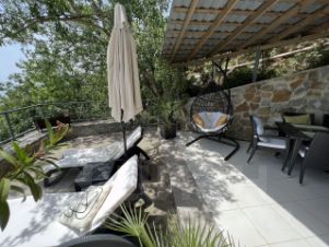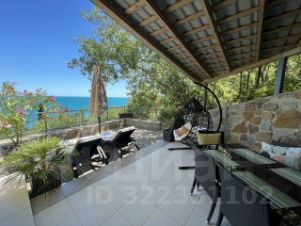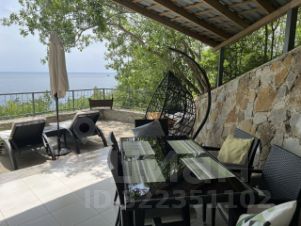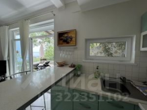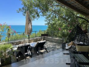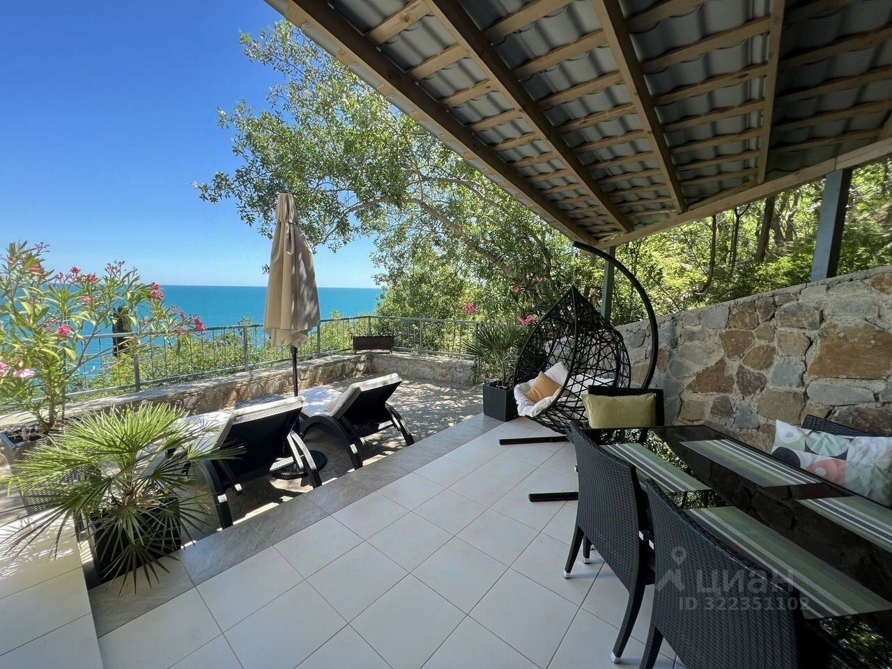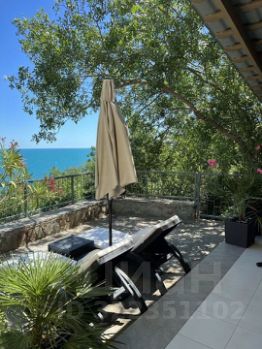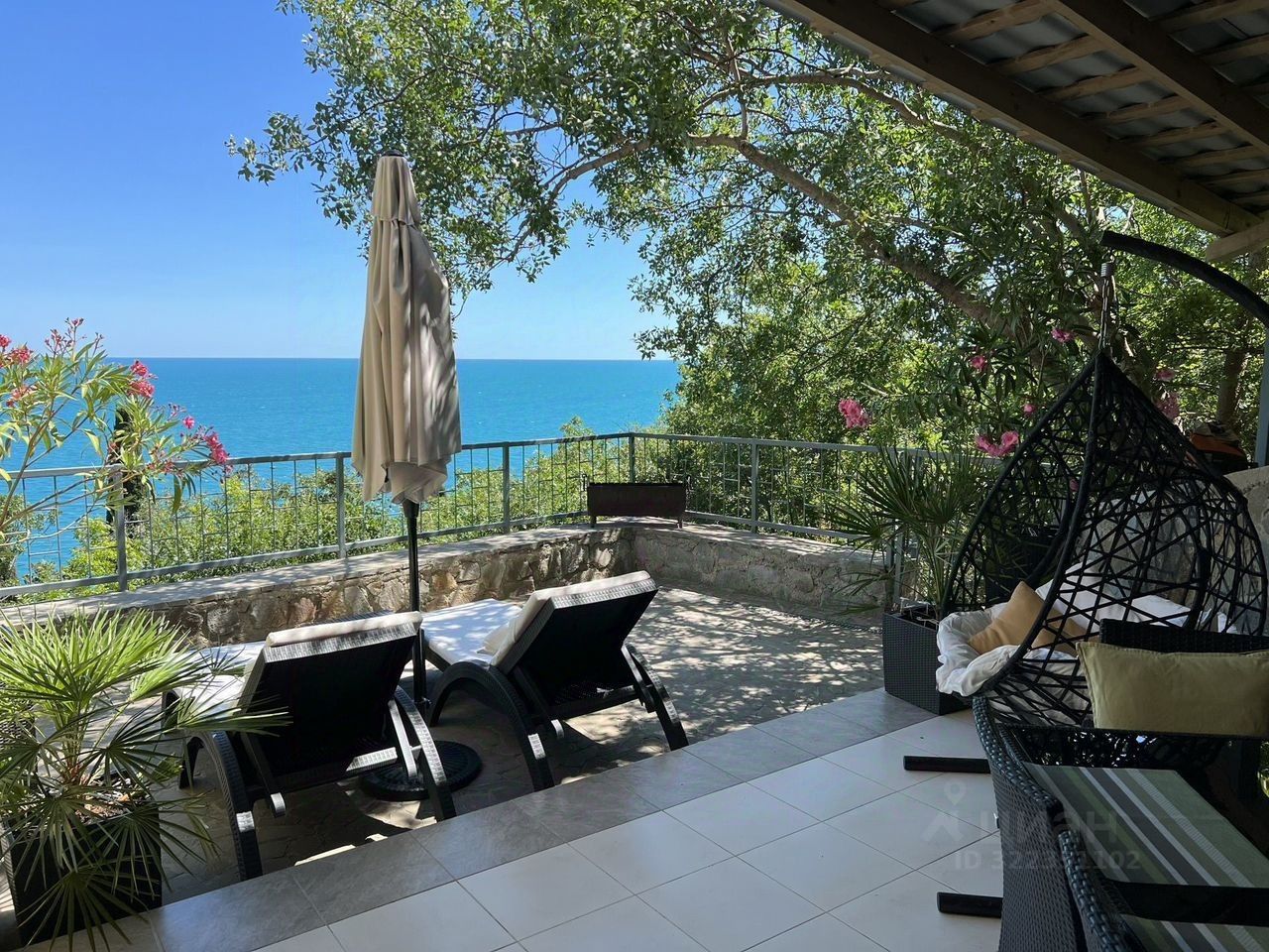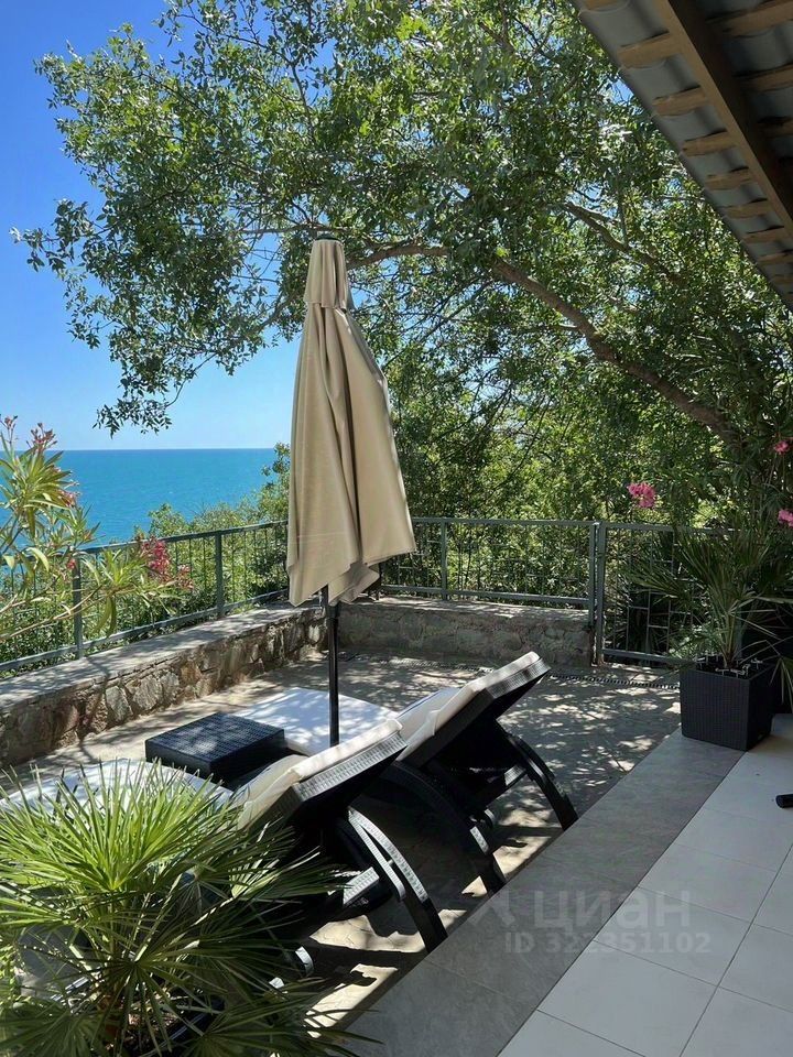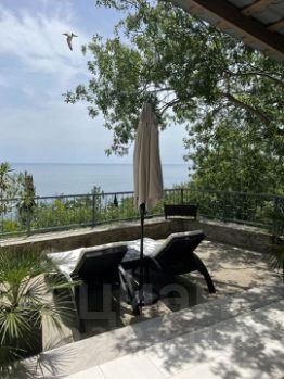 Из кухни-студии - выход на террасу с потрясающим видом на море, где размещена плетеная мебель, стол, мангал, два шезлонга, зонт.