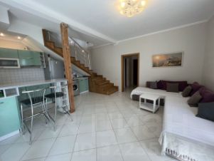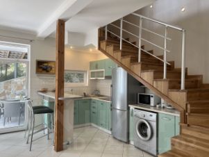 На первом этаже: прихожая комната, в которой находятся гладильная доска и утюг; большая комната (кухня-студия) с удобным раскладывающимся диваном, большим плазменным телевизором (SmartTV), спутниковым TV. Имеется вся необходимая посуда, столовые приборы, стиральная машина, холодильник, электрочайник, тостер, кофе-машина, варочная поверхность, мощная вытяжка, теплые полы, бойлер; ванная комната с душевой кабиной и другими необходимыми атрибутами.
